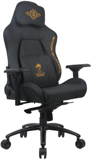 כיסא גיימינג מקצועי בעיצוב חדשני ומיוחד מבית Dragon בעל עיצוב מפואר עם הדפסים של המטבע הוירטואלי המוכר Bitcoin, עם עיצוב חדשני המשלב הדפס רקום בגב וחזית הכיסא של המטבע המוכר עם כריות ראש וגב בעיצוב ארגונומי שניתנות להסרה ובעל בד דמוי עור.