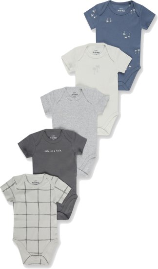 מארז חמישיית בגדי גוף קצרים לתינוקות בסגירת תיק-תקים בחלקו התחתון. מתאים לגיל 18-24 חודשים.