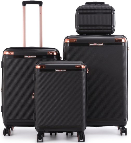 מִפרָט: סט מזוודות קשיחות 20+24+28 אינץ' + תיק איפור מתנה דגם Orlando מבית Swiss Voyager – צבע שחור