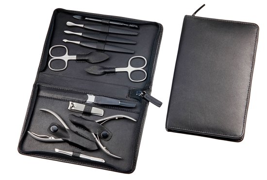 סט מניקור פדיקור 11 חלקים בגימור מבריק סדרת Sunshine מבית HK – נרתיק עור שחור