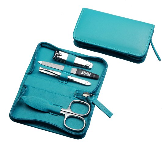 סט מניקור פדיקור 4 חלקים בגימור מבריק סדרת Sunshine מבית HK – נרתיק עור טורקיז