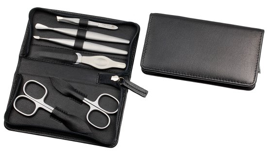 מִפרָט: סט מניקור פדיקור 6 חלקים בגימור משויף סדרת Nobel & Steel מבית HK – נרתיק עור שחור
