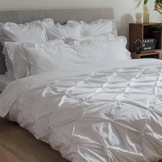 סט מצעים למיטה זוגית כותנה מבית Vardinon. העיצוב של סט מצעים זה מתוחכם ומינימלי, עם אסתטיקה קלאסית של לבן. כיסוי השמיכה מעוטר בדוגמת יהלומים אלגנטית ומרופדת שמוסיפה עומק ועניין ויזואלי לפשטות הלבנה.