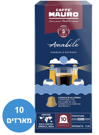 10 מארזים של 10 קפסולות אלומיניום Caffe Mauro Amabile – תערובת חלקה המצביעה על חמיצות נעימה, טעם מעוגל וגוף מלא.