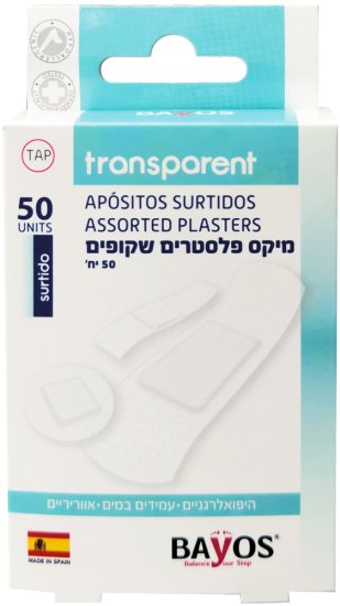 מִפרָט: Bayos – פלסטרים היפואלרגניים שקופים מגוונים – סך הכל 50 יחידות