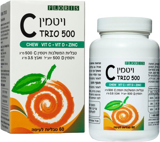 טבליות לעיסה TRIO 500 מבית Floris. פורמולה ייחודית המכילה שלושה רכיבים פעילים, התורמים לחיזוק ההגנה הטבעית של הגוף, במיוחד בתקופת החורף ועונות המעבר.