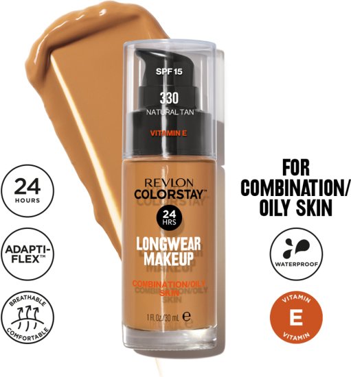 מִפרָט: Revlon – מייק אפ עמיד משאבה Colorstay לעור מעורב/שמן בגוון 330 Natural Tan – נפח 30 מ"ל