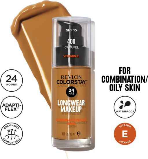 מִפרָט: Revlon – מייק אפ עמיד משאבה Colorstay לעור מעורב/שמן בגוון 400 Caramel – נפח 30 מ"ל